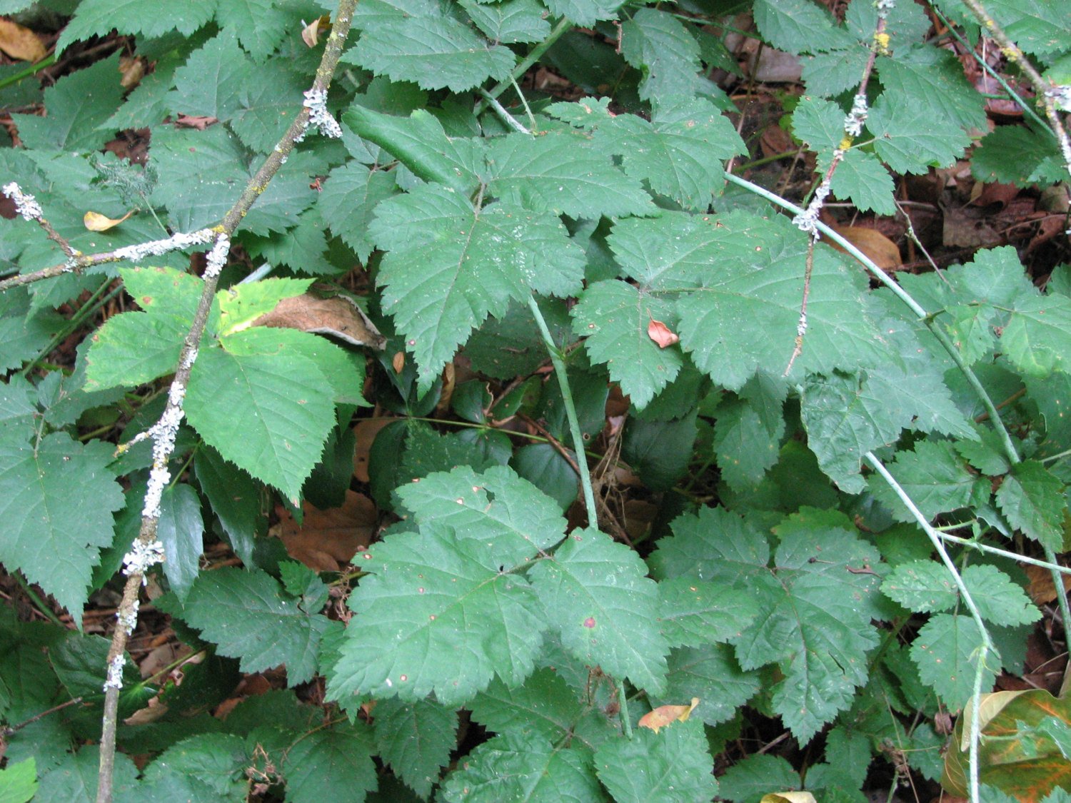 This species is classified as an evergreen, low growing vine, with trailing stems that can extend outwards up to 10 or more feet in length. Its slender stems bear alternate, compound leaflets (3 to 5 leaves). Leaves are ovate, lobed and doubly serrated, 1.5” to 3” in length, and dark green above and paler below. The stems are covered with thorns, which are easily detached.